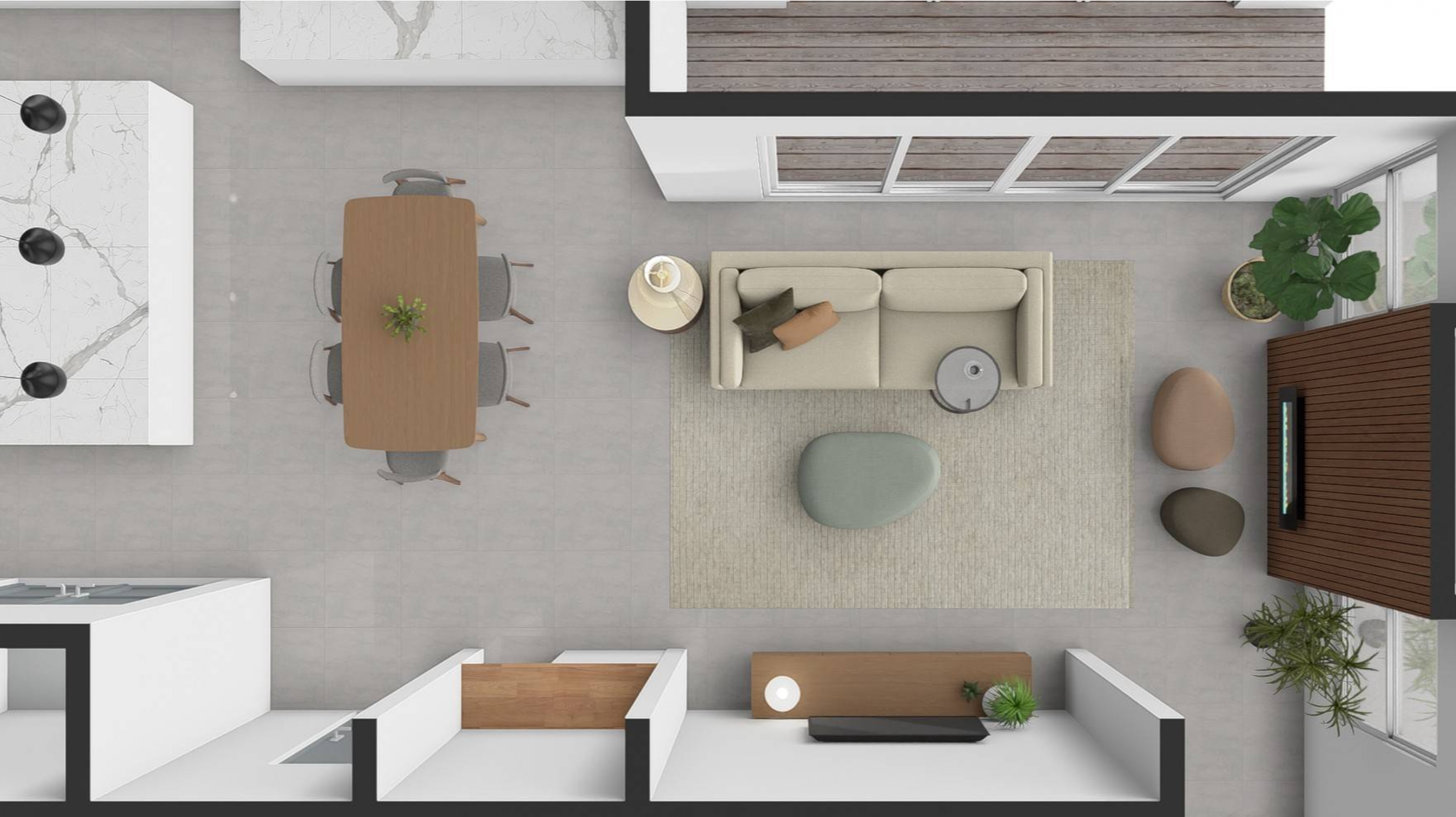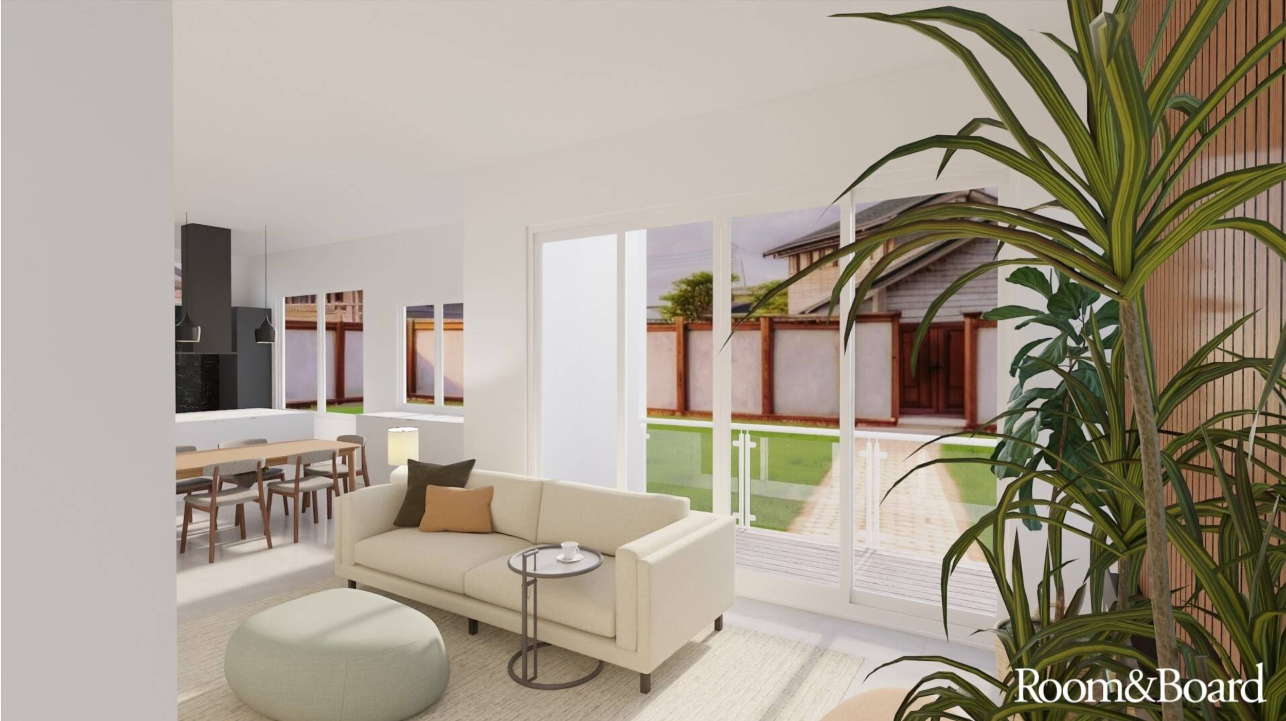 This couple desired an open, organic living/dining space that easily flowed into their kitchen. They wanted to use lighter, natural tones with softer elements of color, and wanted the largest sofa possible in the space that faced the TV, preserved flow through the room, and didn’t impact the inherent airiness of the space.