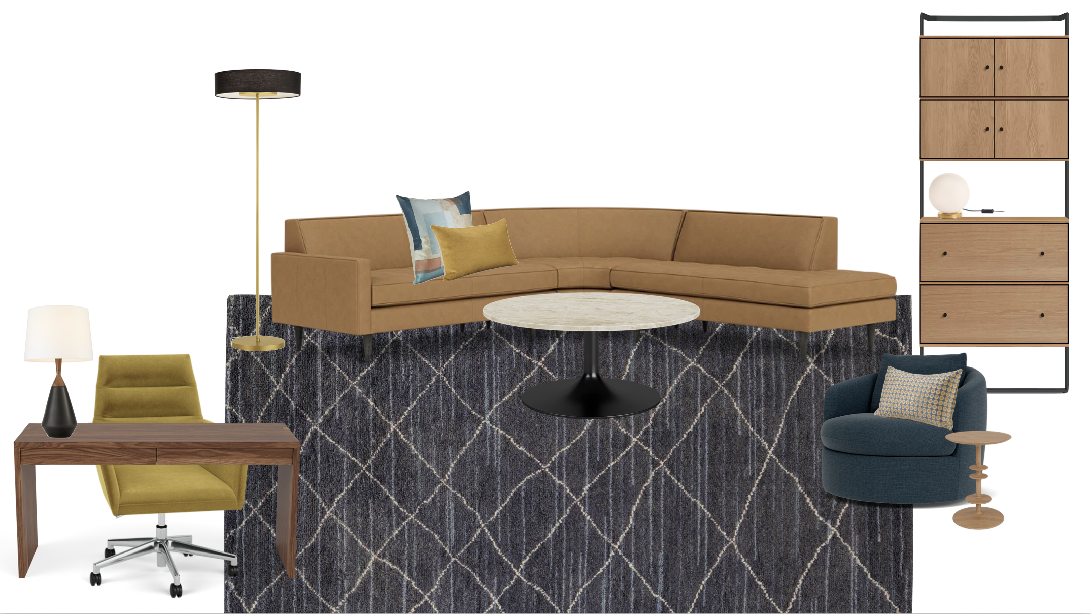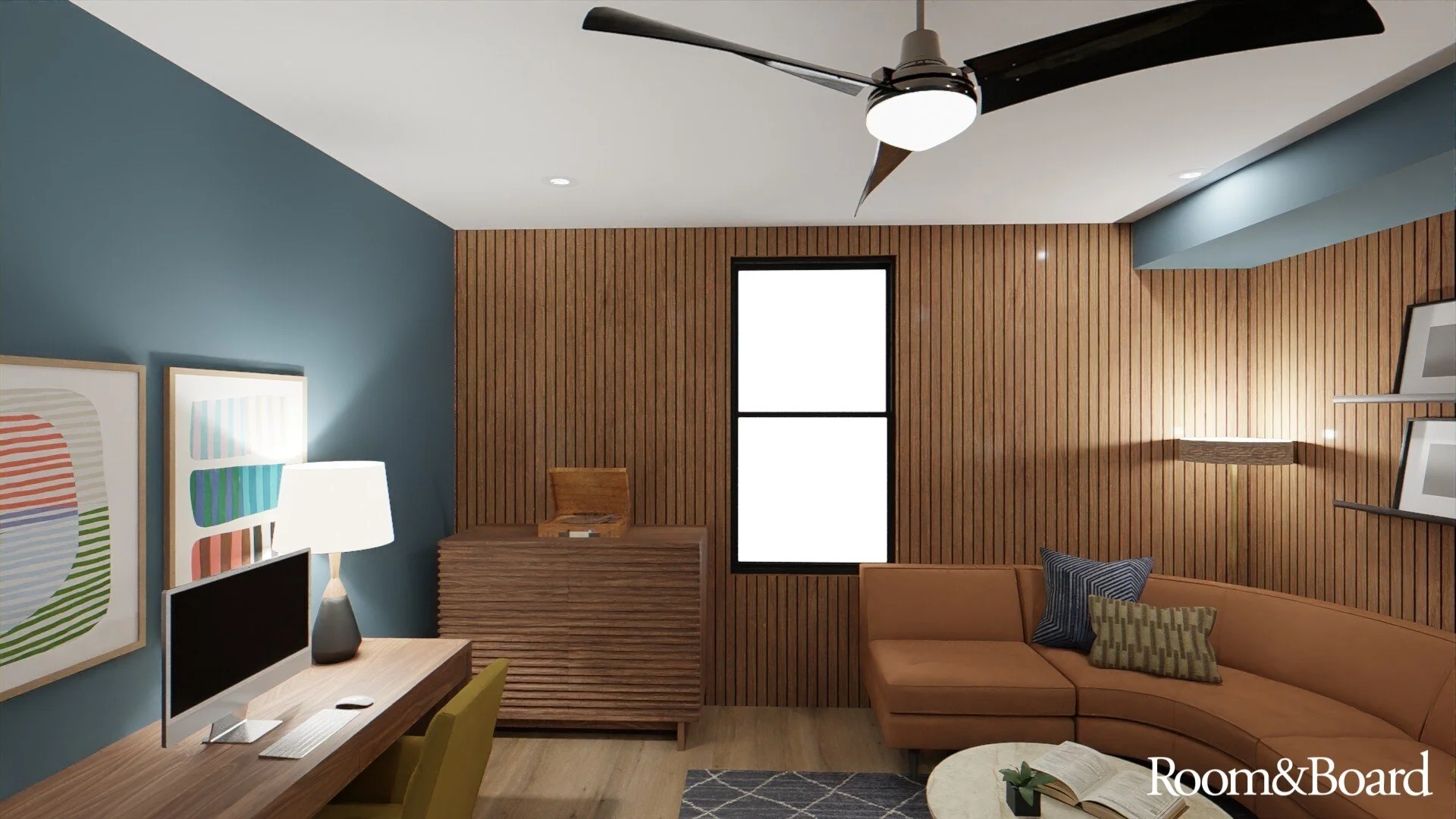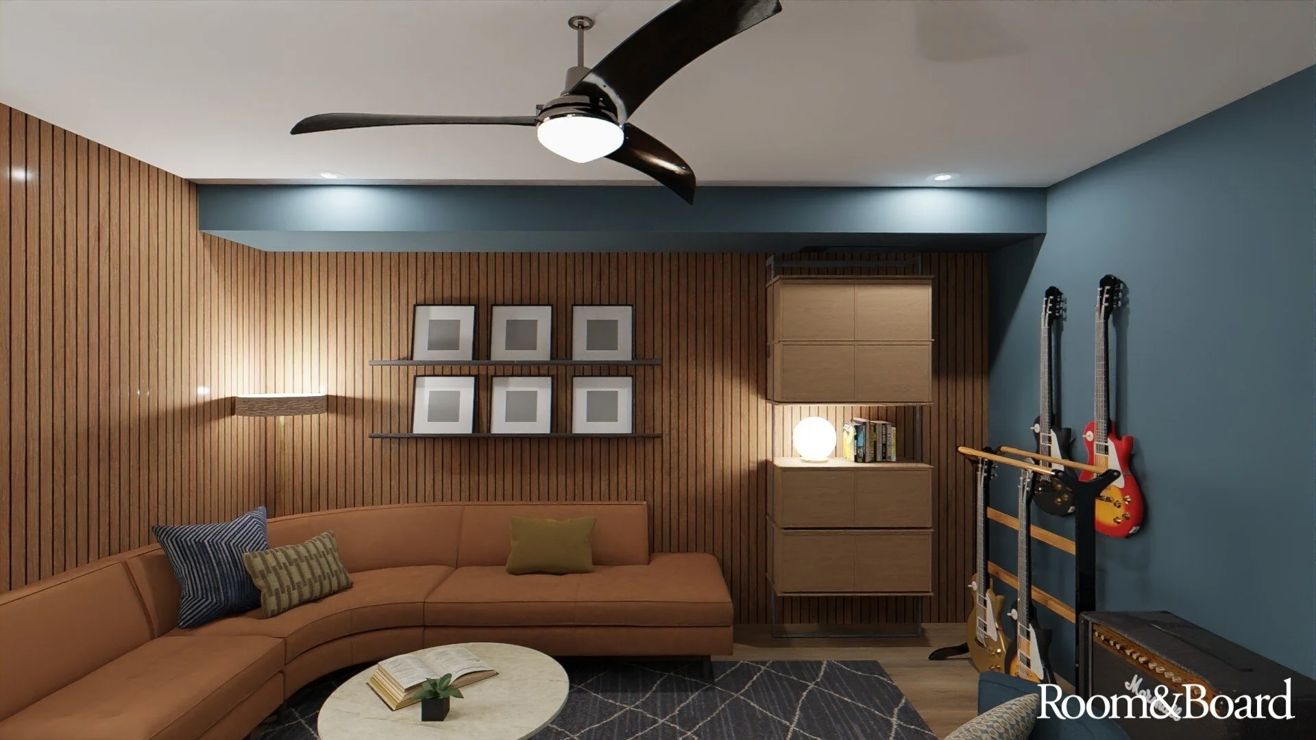 This client wanted a room where they could play guitar, listen to and display their vinyl collection, and generally decompress after a long day. Inspired by a music club they visited in Florida, we used warm leathers, blue/gold/black accents, and wood paneling for both aesthetic appeal and sonic benefits.